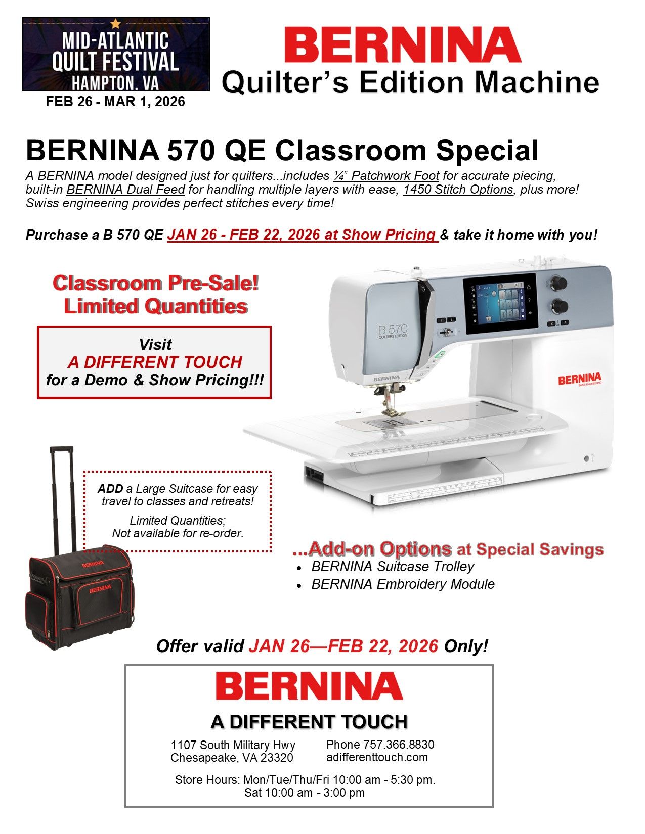 The Mid Atlantic Quilt Festival 2026 is just 4 weeks away. We have pre-sale tickets available in the store for $18.00. This is a $2.00 discount from prices at the door, and you won't stand in line with everyone who is buying the day of the show. Take your pre-sale ticket to a seperate line and get your wrist band for entrance into the show all four days. Quantities are limited so don't miss out.