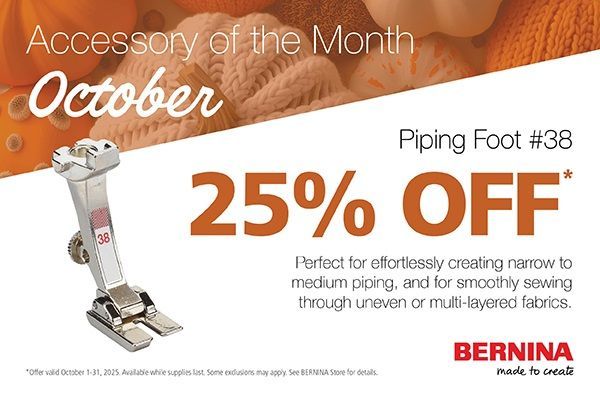 Don't miss the opportunity to add this versatile foot to your collection. Save 25% on the Piping Foot #38—perfect for adding crisp, professional piping and tackling layered seams with ease. Watch below to see what you can do.