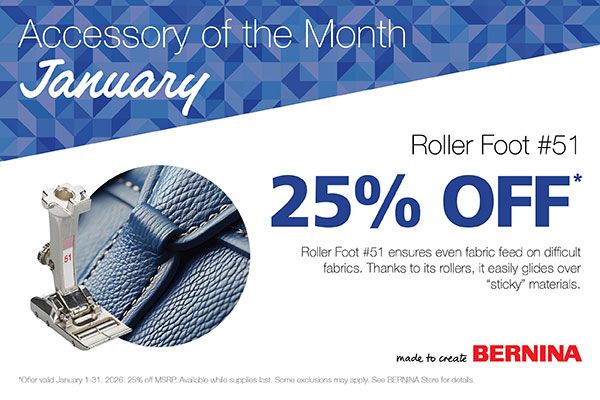 From sewing slick fabrics to stitching through layered materials, the right presser foot can transform how smoothly your projects come together. This January, upgrade your sewing toolkit with the BERNINA Roller Foot #51 and enjoy 25% off all month long—perfect for tackling leather, vinyl, laminates, and more with confidence and precision.