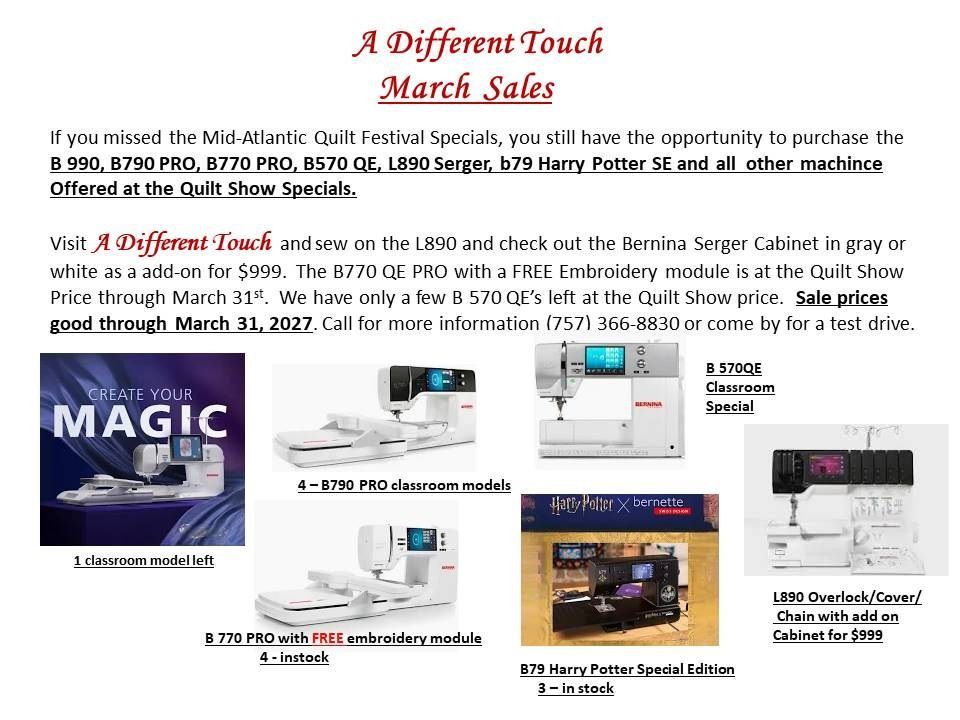 The store will be closed Wednesday, February 25 - Monday, March 2 for the Mid Atlantic Quilt Festival. We will be back to regular business hours at 10:00am on Tuesday, March 3. While you are at the quilt show stop by to say "hi". IF we aren't too busy selling machines we'll say "hi" back.