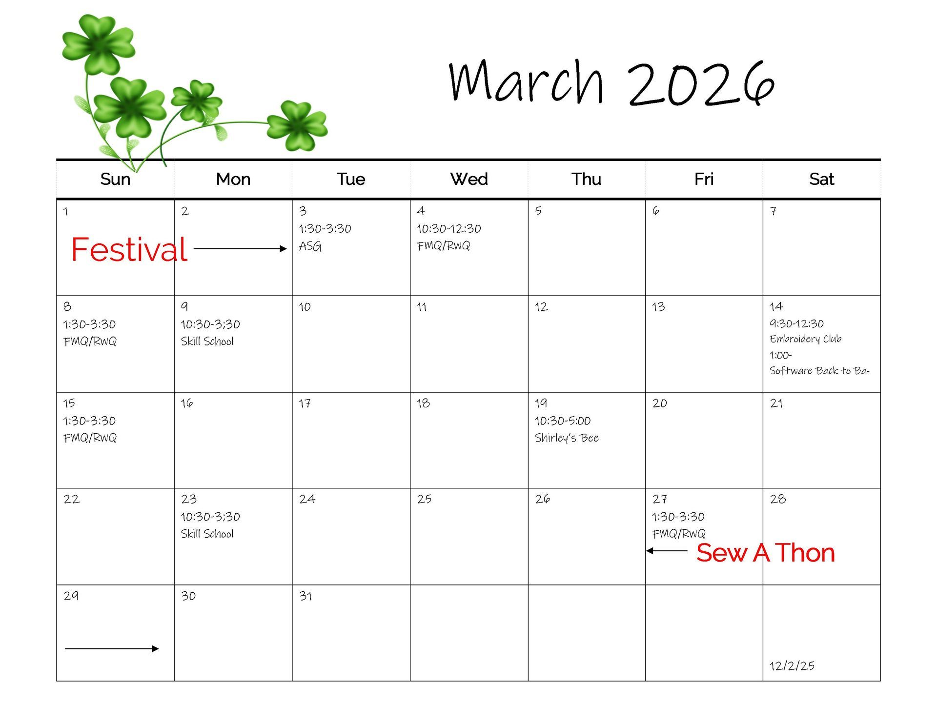 What is Skill School? It is a 3 month course with classes twice a month, designed for beginners (or anyone who wants to brush up on their skills). We start at the beginning with how to cut straight strips and how to accurately sew a 1/4" inch. You will learn half square triangles making traditional blocks like the Spool and the Log Cabin. At the last classes we will cover basting, quilting and how to bind your quilts. March 9 and 23, April 14 and 28, May 12 and 26. 10:30-3:30, $150.00. Hope to see you in class soon!