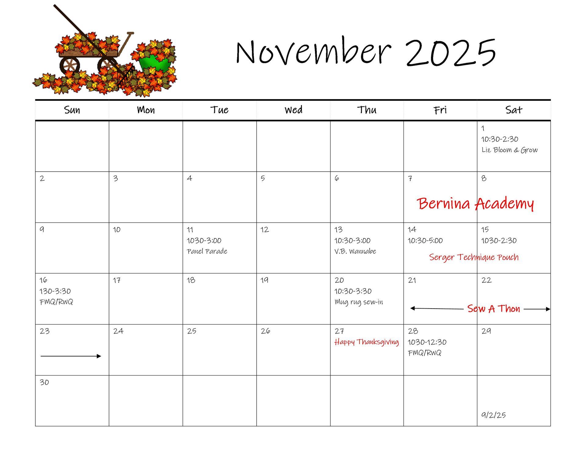 Two-Day Event: Serger Techniques Pouch Liz Peake, instructor. Bring your own snacks / lunch. Partial Kit Provided – you provide the fabric and thread. Kit consists of the fusible fleece, the cording, and the polyweave zippered pouch – you select the zipper color. See sample pouch in the store. Limited seating to 8. Waitlist available. Note: This IS NOT a Bernina Ambassador Retreat This project features an abundance of decorative overlock stitches and techniques for the front of the bag, a no-sew zipper, and showcases coverstitch and chain stitches for the back. Options will be shown to stitch the back with overlock stitches too. Basically, all sergers welcomed! The Serger Techniques Pouch by Stitch It Sisters pattern required and available at the store. Use your fabric from your stash. Select your fabric / colors for your pouch according to the pattern supply list. Attended this event before? Join us again using different decorative stitches in the front. Attendees are required to pay when registering. Each attendee will receive more information before the event. Note: sergers may be left overnight in the classroom on the 14th! Friday Nov, 14, 10:30 AM – 5PM and Saturday, Nov, 15 10:30 – 2:30PM. $35.00 for both days. Kit fee additional.